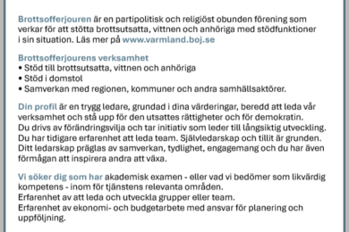Ett volontäruppdrag på Brottsofferjouren är intressant, lärorikt och din insats gör skillnad. Som volontär hos oss får du: Är du nyfiken och vill veta mer om att vara volontär inom Brottsofferjouren? Då är du välkommen på informationsmöte den 2 september. Datum: 2 september 2025Tid: Välj mellan kl. 13.00-16.00 eller 17.00-20.00Plats: Drottninggatan 30, Karlstad Ange vilken […]